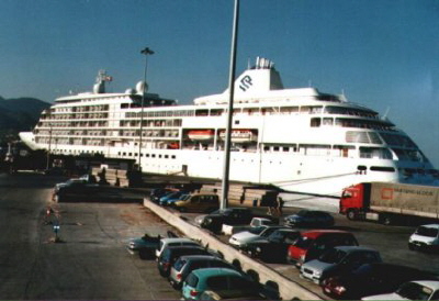 Ab und an wird es dunkel in Agios. Dies liegt nicht an eventuellen Wolken. Nein, riesige Kreuzfahrtschiffe blokieren den Hafen. Auf diesem Bild ist die "Silver Star" zu sehen, ein Luxusliner der unter der Flagge der Bahamas fährt. Sein Heimathafen ist Nassau. Mindestens einmal pro Woche macht ein Kahn dieser Größe in Agios Station. Unzählige Touri-Busse warten dann am Hafen auf die Ausflügler. Wohin die Touren gehen, kann ich nicht sagen. Aber das interessiert hier ohnehin niemanden. |
