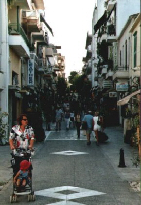 Sucht man in Agios Nikolaos nach einem passenden Mitbringsel, so wird man überall recht schnell fündig. Groß hingegen ist die Auswahl an Trödelläden in der Strasse des 28. Oktober. Die einzige Fußgängerzone von Agios ist gleichzeitig auch eine richtige Flaniermeile. So sieht die Strasse aus, wenn man vom Hafen aus Richtung Platia E. Venizelou blickt. |