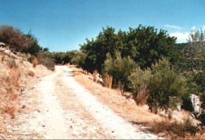 Auf unserer Wanderung von Kritsá nach Ammoúdara benutzten wir zahlreiche solcher Wege. Auf einer unserer Strassenkarten war dieser Weg sogar als "Gelbe Strasse" eingetragen. Überall am Wegesrand standen die allgegenwärtigen Olivenbäume. Zikaden zirpten unablässig und die Sonne brannte erbarmunslos. Unsere Wasservorräte waren zwar noch nicht aufgebraucht, aber inzwischen gut gekocht. |